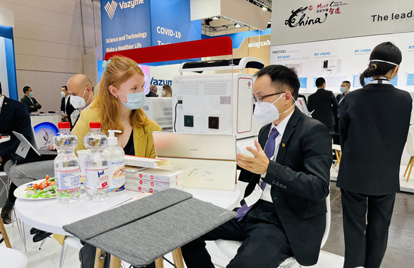 在经过同行推荐并使用了bb贝博艾弗森产品后,一位从事检测工作十多年的苏丹客户专门找到bb贝博艾弗森展台,进一步了解bb贝博艾弗森新冠和其他试剂检测业务。看完bb贝博艾弗森方案的操作后,他频频点头并表示,“你们的方案应用场景广、操作简便、精准可及,我非常看好你们!”